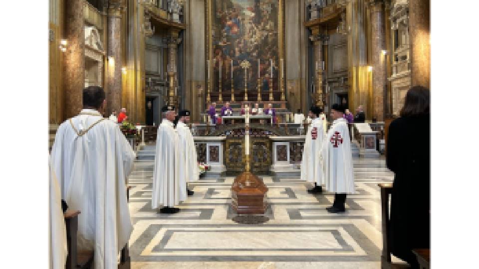 Présidée par le cardinal Fernando Filoni, Grand Maître de l'Ordre du Saint-Sépulcre, la célébration des funérailles du Professeur Agostino Borromeo, Lieutenant Général d’Honneur de l'Ordre du Saint-Sépulcre de Jérusalem, s'est déroulée dans la basilique des Saints-Apôtres à Rome, le 6 février 2024. La messe a été concélébrée par Mgr Tommaso Caputo, Assesseur de l'Ordre, et Mgr William Shomali, Vicaire patriarcal pour Jérusalem et la Palestine, représentant le Patriarche de Jérusalem. Ont également participé à la célébration le cardinal Edwin O'Brien, qui était Grand Maître de l'Ordre lorsque le Professeur Borromeo assumait la charge de Gouverneur Général, Fra' John Dunlap, Grand Maître de l'Ordre de Malte, et Fra' Alessandro de Franciscis, Grand Hospitalier.